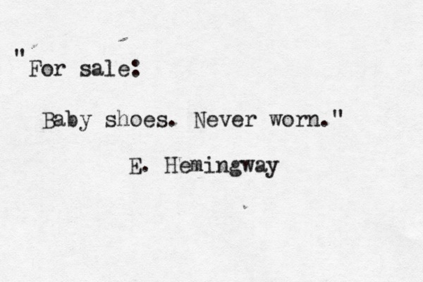 Ένα από τα διαρκή ερωτήματα που τίθενται μεταξύ συγγραφέων και λοιπών παραμυθάδων αποτελεί το εξής: πόσες λέξεις είναι -ή δεν είναι- αρκετές για να ειπωθεί μια ολοκληρωμένη ιστορία; Μία αφήγηση με αρχή, μέση και τέλος, με ολοκληρωμένη πλοκή κι ακόμα πιο ολοκληρωμένο κύκλο συναισθημάτων; Ο Ernest Hemingway φαίνεται να έδωσε την απάντηση όταν, αξιοποιώντας έναν τίτλο της πρωινής εφημερίδας και έξι μόλις λέξεις, αφηγήθηκε το πιο συνταρακτικό γεγονός στην ιστορία της λογοτεχνικής δημιουργίας, γράφοντας: