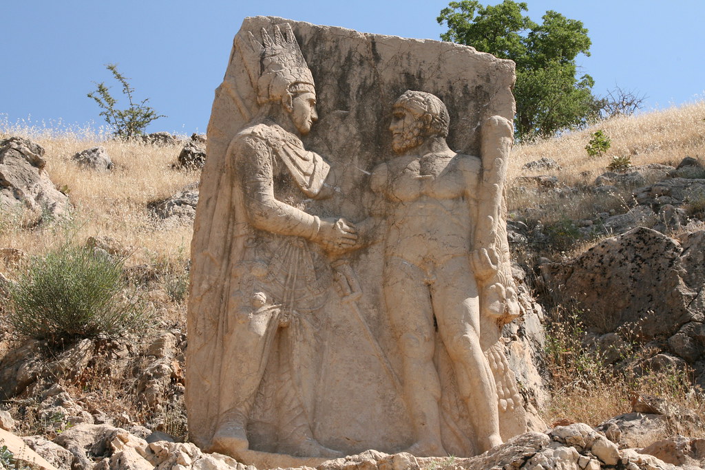 Ο βασιλιάς Αντίοχος δίνει χειραψία στον ήρωα της Ελληνικής μυθολογίας Ηρακλή. Ανάγλυφη στήλη του όρους Νεμρούτ. Πηγή: Flickr