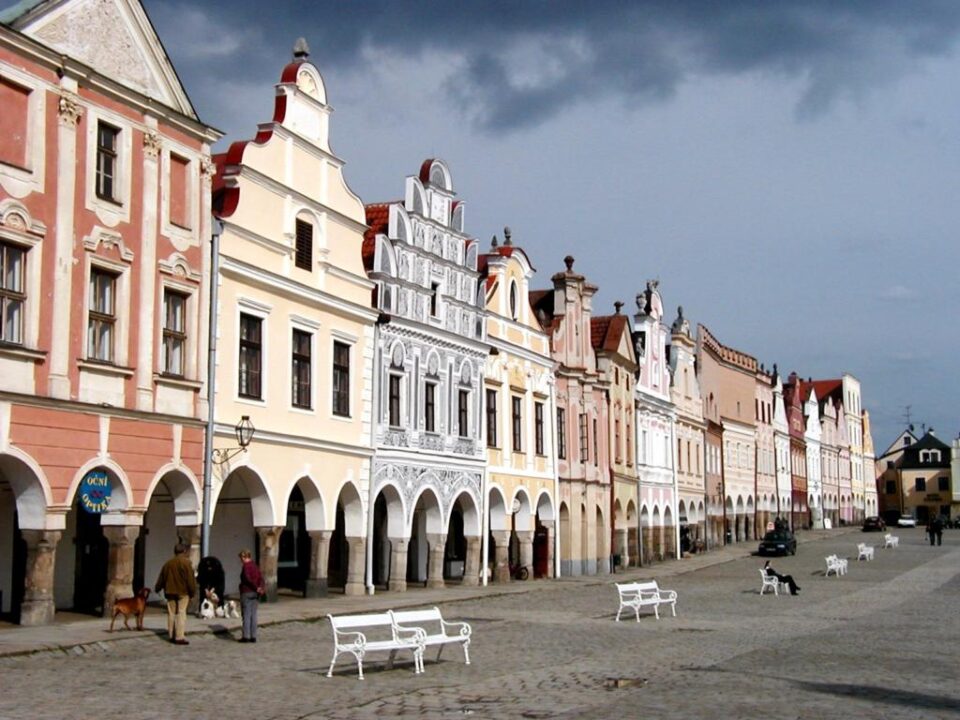 Η πρώτη σας επίσκεψη στο Telč θα ξεκινήσει επισκέπτοντας την πλατεία Hradec. Κατά μήκος των τριών πλευρών της δημόσιας πλατείας υπάρχουν ζωηρά ζωγραφισμένα σπίτια ιταλικού αναγεννησιακού στυλ. Τα σπίτια έχουν πολύχρωμες προσόψεις και όμορφες στοές από κάτω. Οι στοές των σπιτιών φιλοξενούν καφετέριες και καταστήματα όλων των ειδών.