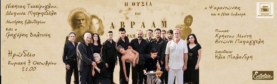 Η θυσία του Αβραάμ, το αριστούργημα της κρητικής λογοτεχνίας, του Βιτσέντζου Κορνάρου θα παρουσιαστεί στο Ωδείο Ηρώδου του Αττικού την Κυριακή 7 Οκτωβρίου σε σκηνοθεσία Ηλία Μαλανδρή και μουσική Χρήστου Λεοντή και Αντώνη Παπαγγελή, με μια μοναδική σύμπλευση κορυφαίων καλλιτεχνών, όπως ο Νικήτας Τσακίρογλου, η Δέσποινα Μπεμπεδέλη, ο Γρηγόρης Βαλτινός, ο Λευτέρης Ελευθερίου, αλλά και ο Ψαραντώνης με την Νίκη Ξυλούρη, πλαισιωμένοι από την Χορωδία Βυζαντινής Μουσικής «Τέττιξ» υπό την διεύθυνση του πρωτοψάλτη Γιώργου Ναούμ, καικαταξιωμένους ηθοποιούς, μουσικούς και χορευτές.