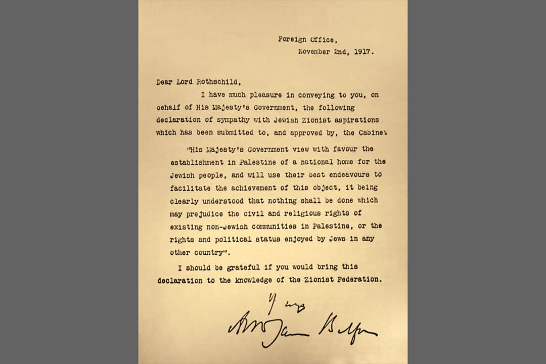Στις 2 Νοεμβρίου 1917 ο Άρθουρ Μπάλφουρ, Υπουργός Εξωτερικών της Βρετανίας, προχώρησε στην υπογραφή μιας επιστολής προς τον Λόρδο Λάιονελ Ουόλτερ Ρόθτσιλντ, τον ύπατο εκπρόσωπο της βρετανικής εβραϊκής κοινότητας. Με τη συγκεκριμένη επιστολή το Ηνωμένο Βασίλειο δήλωνε πως τασσόταν υπέρ της ίδρυσης εβραϊκού κράτους στην Παλαιστίνη. Η Διακήρυξη Μπάλφουρ από τότε έμεινε στην ιστορία.