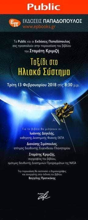 Η παρουσίαση του βιβλίου ΤΑΞΙΔΙ ΣΤΟ ΗΛΙΑΚΟ ΣΥΣΤΗΜΑ θα πραγματοποιηθεί την Τρίτη 13 Φεβρουαρίου 2018, 20:30, Public Cafe Συντάγματος (Καραγιώργη Σερβίας 1).